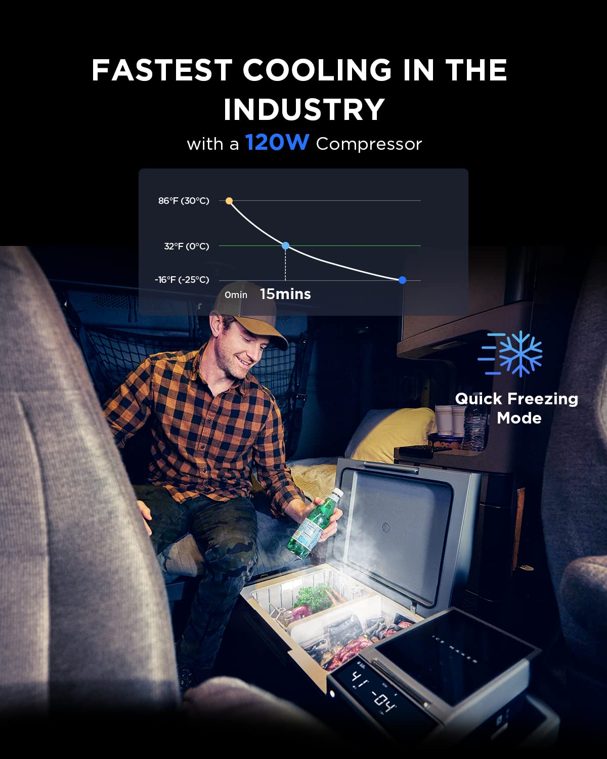 - [Industry's First Integrated Ice Maker] In addition to freezing, this portable car refrigerator can also bring you 18 solid ice cubes in 12 minutes by a 120w powerful compressor