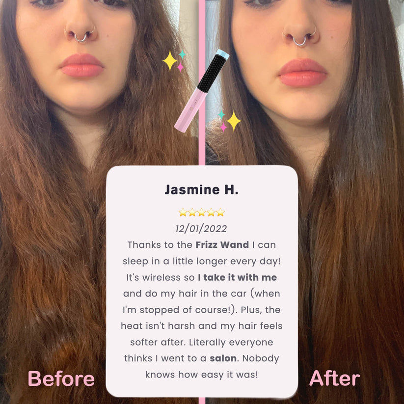 Customers love their Frizz Wand. It relaxes hair to reduce frizz, glides smoothly to prevent damage, and even has a hot setting to straighten your hair. Plus, it's wireless so you can style anywhere. We guarantee you'll love it. Try your Frizz Wand risk free for 30 Days.