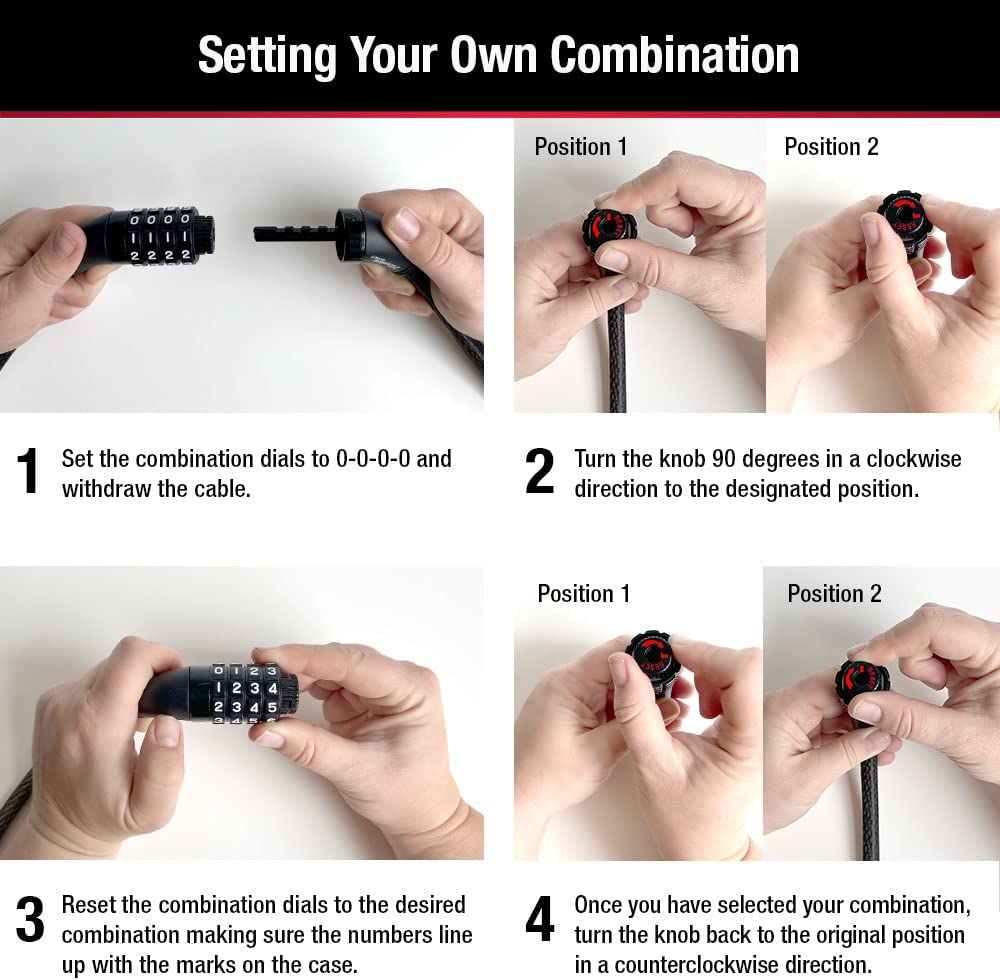 The Master Lock 8143D Preset Combination Cable Lock is 4 ft. (1.2 m) long and features a 5/16 in. (8 mm) diameter braided steel for maximum strength and flexibility. The protective vinyl coating protects against scratches. The 4 dial combination security offers keyless convenience. The Lifetime Guarantee provides peace of mind from a brand you know and can trust.