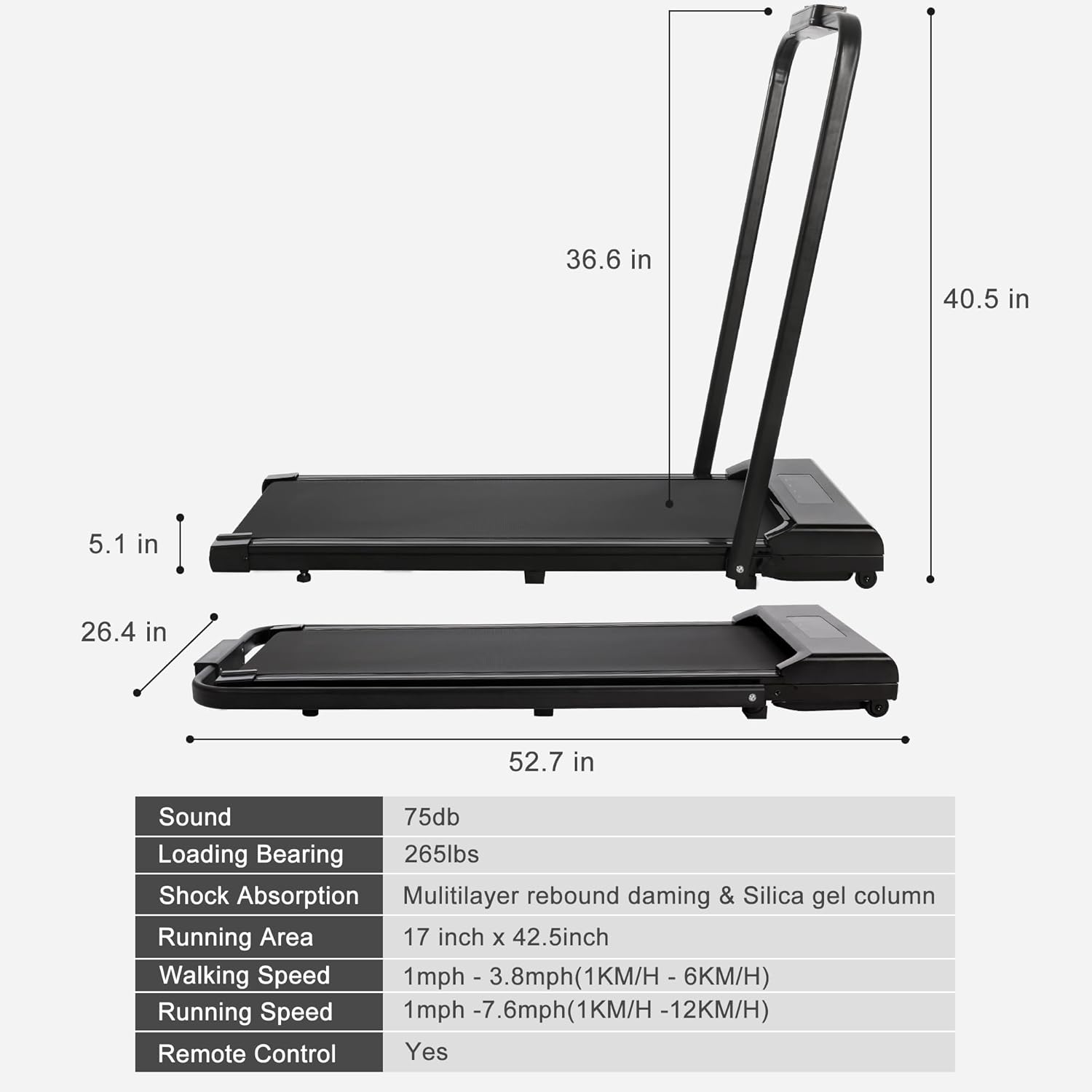 - 【Quiet & Powerful 2.5HP Motor】Our Foldable Treadmill features a robust yet quiet 2.5HP motor, accommodating up to 265 lbs. This treadmill offers the versatility to run up to 6.2 MPH or set a relaxed walking pace using the remote control, all while maintaining a low noise level for an undisturbed workout.